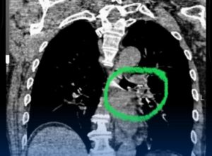 У пациента диагностировано инородное тело в левом главном бронхе — кусочек яблока размером 2,0х1,5 см, полностью перекрывавший дыхательные пути. Ситуацию значительно осложняли сопутствующие заболевания: последствия перенесенного острого нарушения мозгового кровообращения (1995 г.), дизартрия, левосторонний гемипарез, а также артериальная гипертензия III степени (ФК 4).